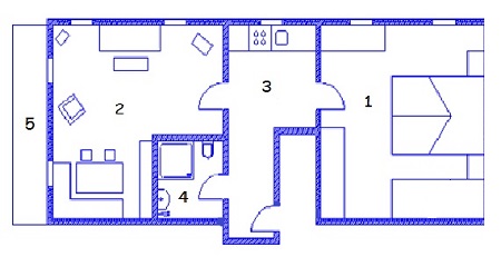 Grundriss Wohnung A: 58qm 1. Schlafzimmer 2. Wohn- und Esszimmer 3. Küche 4. Bad mit Dusche und WC 5. Balkon | |||||||||||||||||||||||||||||||||||||||||||||||||||||||||||||||||||||||||||||||||||||||
